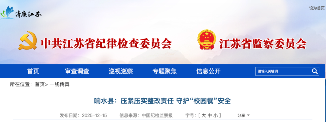 “校园餐”关系广大学子切身利益,牵动着无数家长的心。响水县纪委监委立足“监督的再监督”职责定位,聚焦学生膳食经费使用、食材大宗采购、校园食品安全等重点环节,督促职能部门自查自纠,并开展常态化监督检查,发现问题立行立改,跟进启动问责机制,推动“校园餐”突出问题整治工作走深走实。