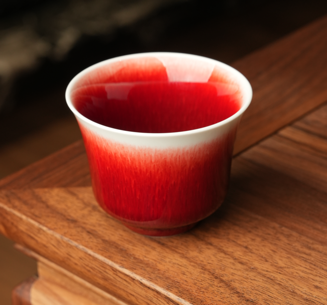 釉里红芙蓉花盖碗,以高温釉里红工艺烧制:钴红料经一次窑火发色,芙蓉花纹线条柔润舒展,红釉浓淡层次自然,色透釉骨尽显“宝石红韵”的古典质感。