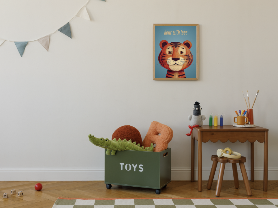提示词:宝宝在图2的场景下拍一张写真照,宝宝穿着小老虎的头套和同款针织衣。