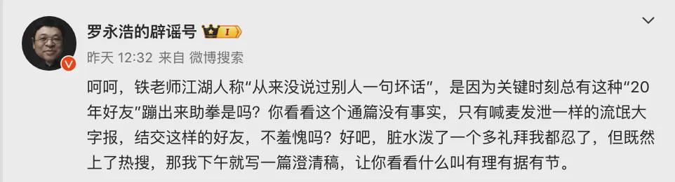 罗永浩还放了狠话:“如果你们真想帮铁老师,请不要再惹我了,我先替铁老师谢谢你们了。真把我惹火了,整理一下新东方三十年的猛料写一本书出来,铁老师就只能退休了。”