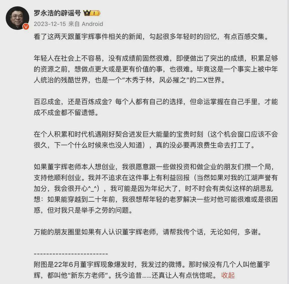 罗永浩与俞敏洪再次一起登上热搜,是2023“小作文事件”,原本是董宇辉和东方甄选的矛盾,原本是千万“丈母娘们”不满东方小孙和俞敏洪,但罗永浩却跳出来发声支持董宇辉。