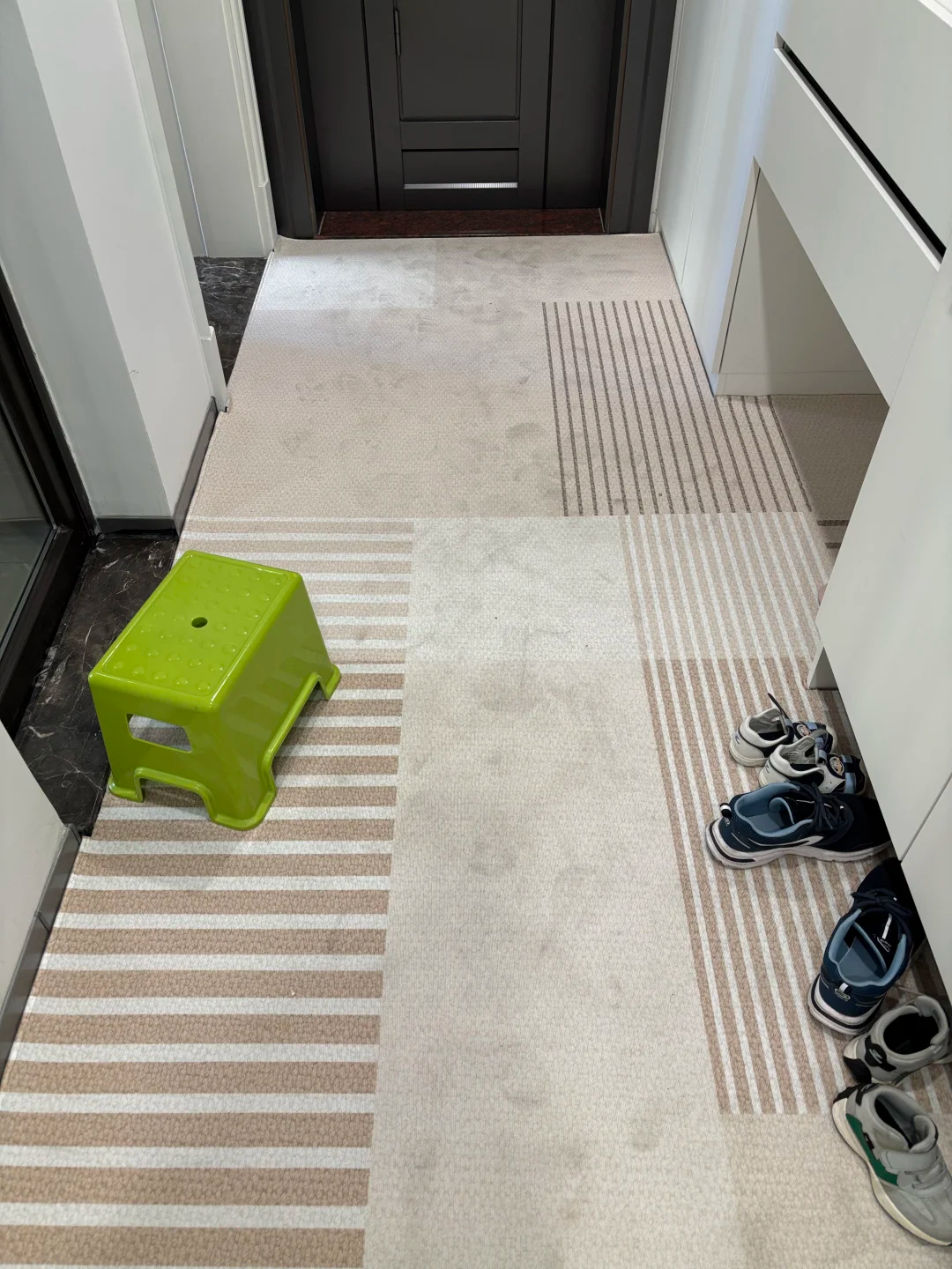客厅的地毯,门口的地垫,厨房的地垫,以及卫生间门口的地垫,其实这些地垫完全可以不用铺,你有没有发现,家里的面积本来就不大,而铺上了这些地毯地垫之后,
