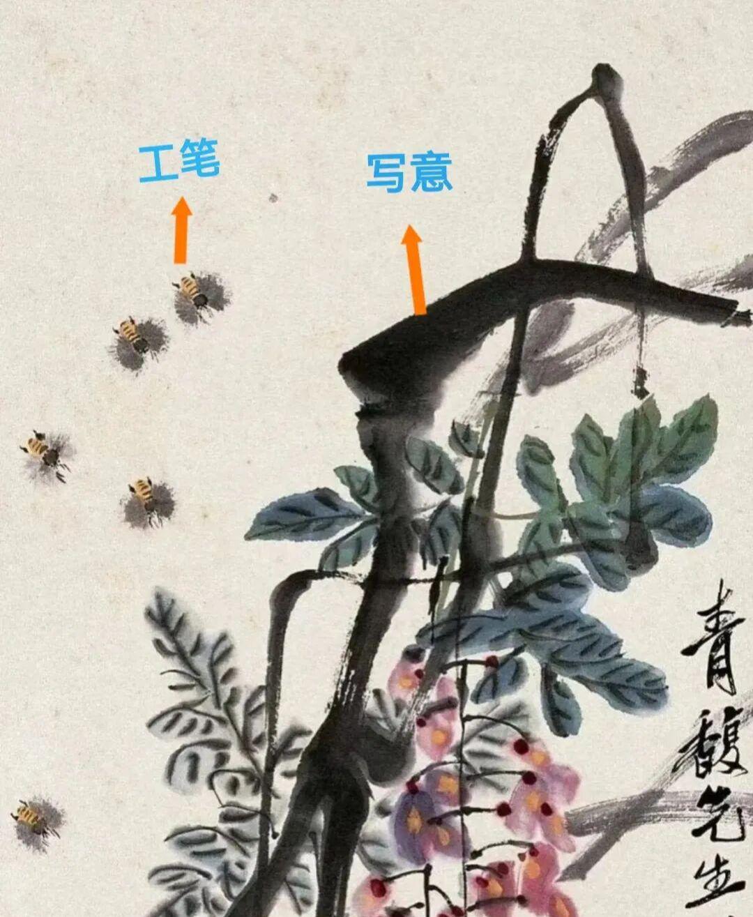 在大写意的藤蔓和花叶之间,他常常用工细的笔法描绘蜜蜂、蝴蝶、蜻蜓等草虫。这些精细入微的小生命与奔放写意的大背景相映成趣,增添了画面的生动感和情趣,也是他艺术的一大特色。