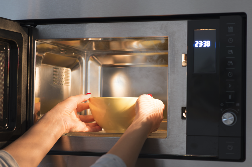 微波加热食品须严格遵守“去膜、开盖、换碗”原则,加热任何带包装的食品,务必撕去塑料薄膜;