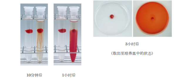 NKCP对人工血栓的溶解作用:在含有人工血栓的生理盐水中加入少量NKCP,几分钟后血栓即开始溶解,3小时后血栓几乎完全被溶解。(各枚照片的左侧为作为对照的生理盐水,右侧为加入了NKCP的生理盐水)