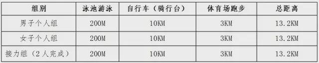3.接力组由两人接力按顺序完成游泳、自行车、跑步项目,项目分配无硬性规定,队员可自行安排;