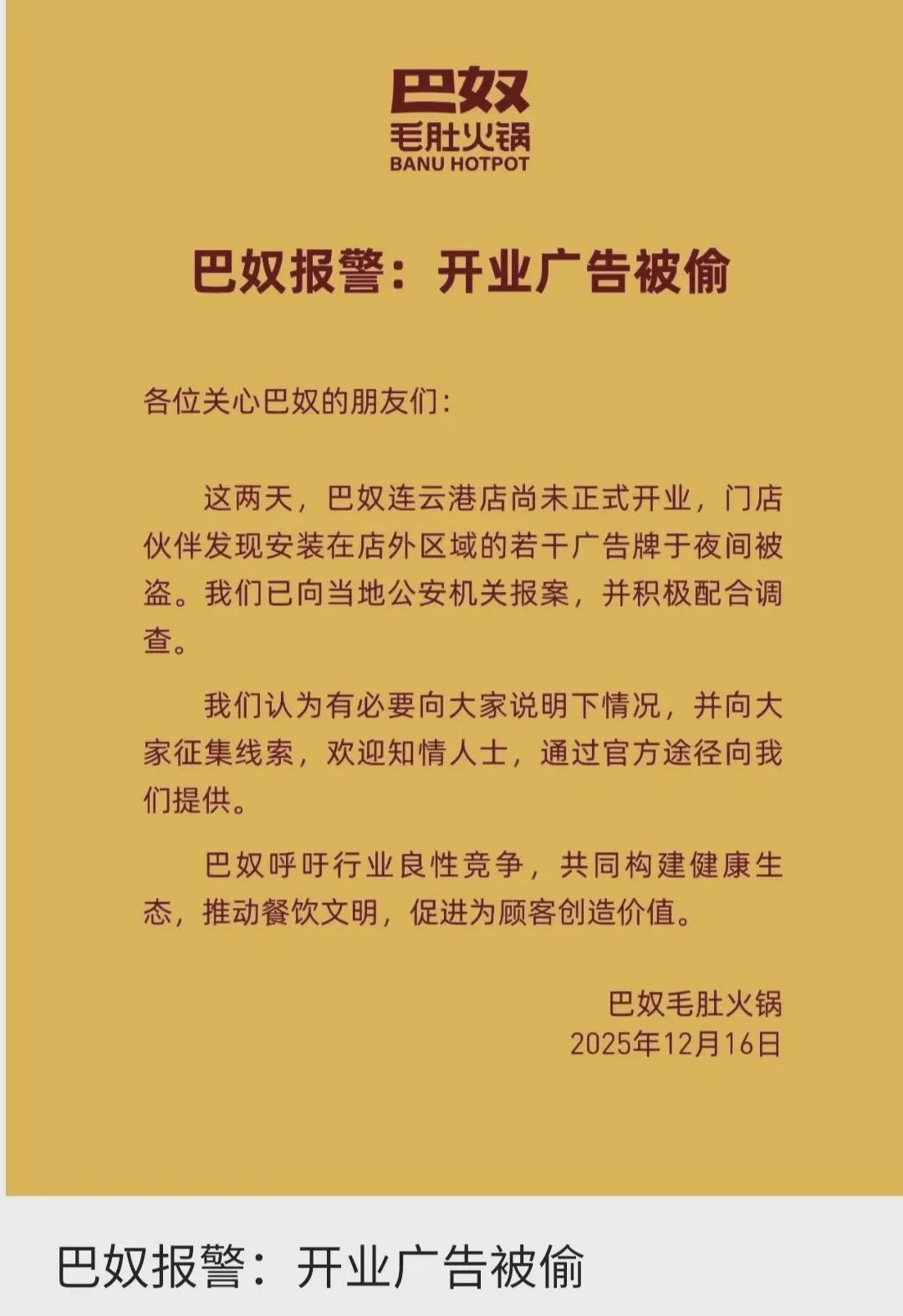 不过就在巴奴火锅更新招股书的头一天晚上,12月16日晚间,巴奴毛肚火锅微信公众号发布公告称,“巴奴连云港店尚未正式营业,开业广告被偷,巴奴已报警”。此事引发不少网友关注。