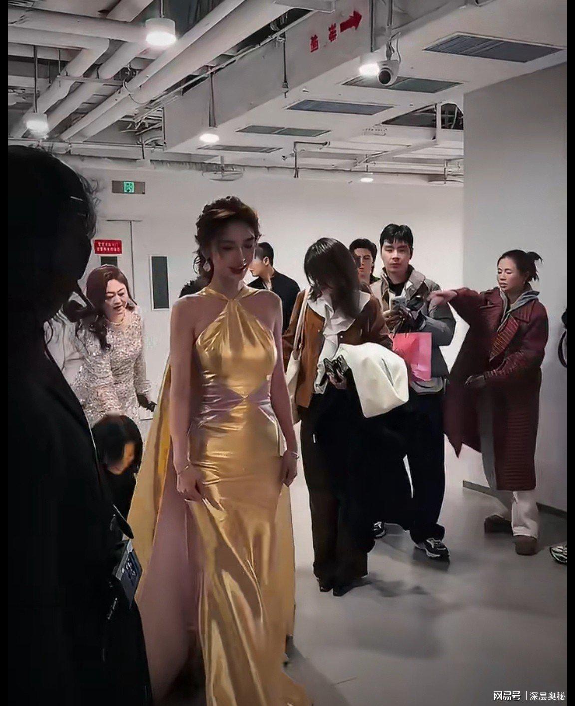 造型亮点,身穿 Alexis Mabille 2024秋冬高定鎏金长裙,搭配拖尾披风与微卷麻花辫,整体呈现“女皇登基”般的雍容气场。部分网友指出此为品牌过季礼服,引发对资源降级的讨论。