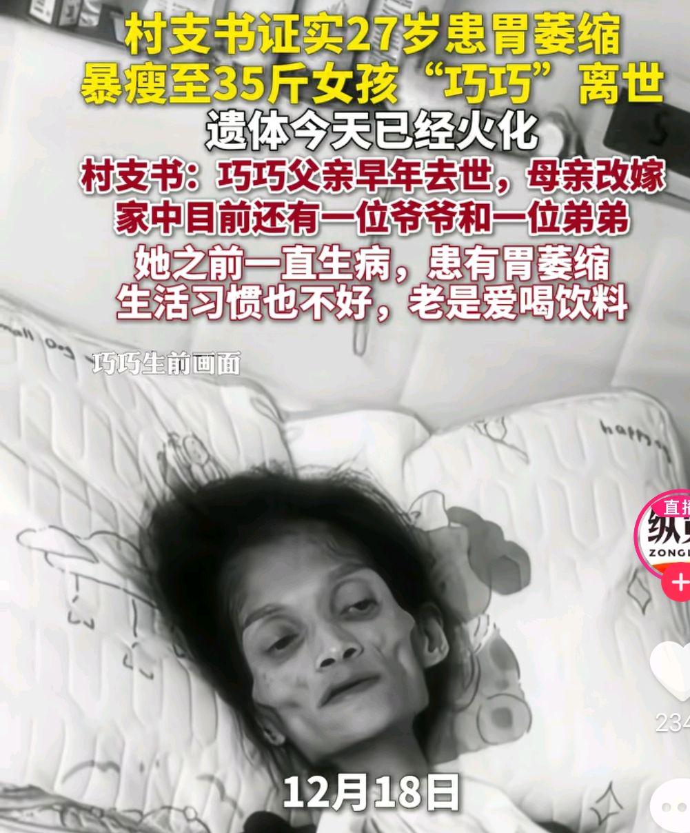 12月19日,有些博主宣布广东27岁女孩巧巧去世了。她是在12月17日凌晨1点左右去世的,18日已经火化,19日下葬。