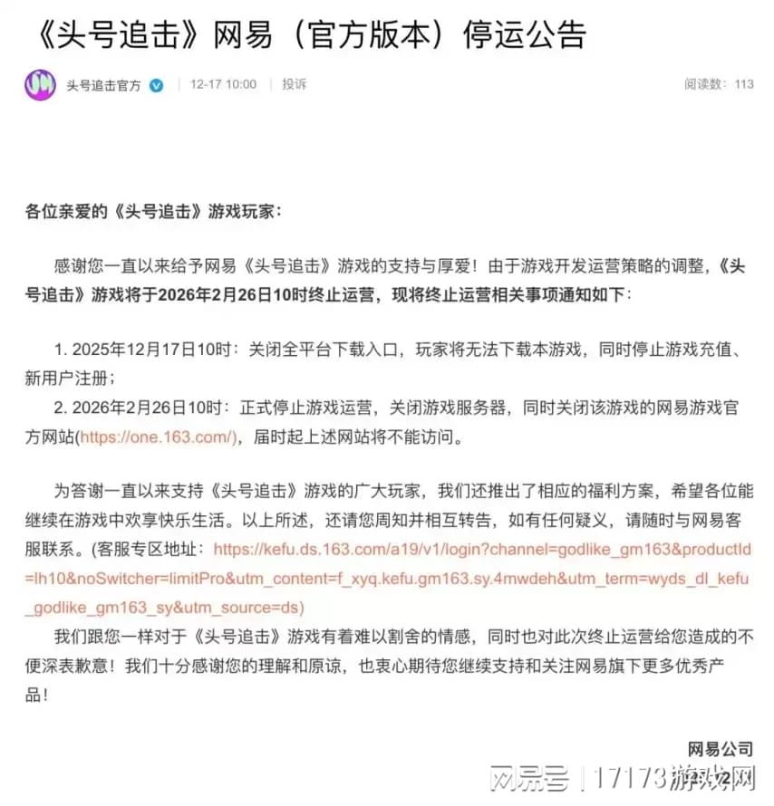 网易的《头号追击》宣布将于2026年2月26日正式终止运营,这款游戏从今年7月24日上线到宣布停运,运营时间不足半年。