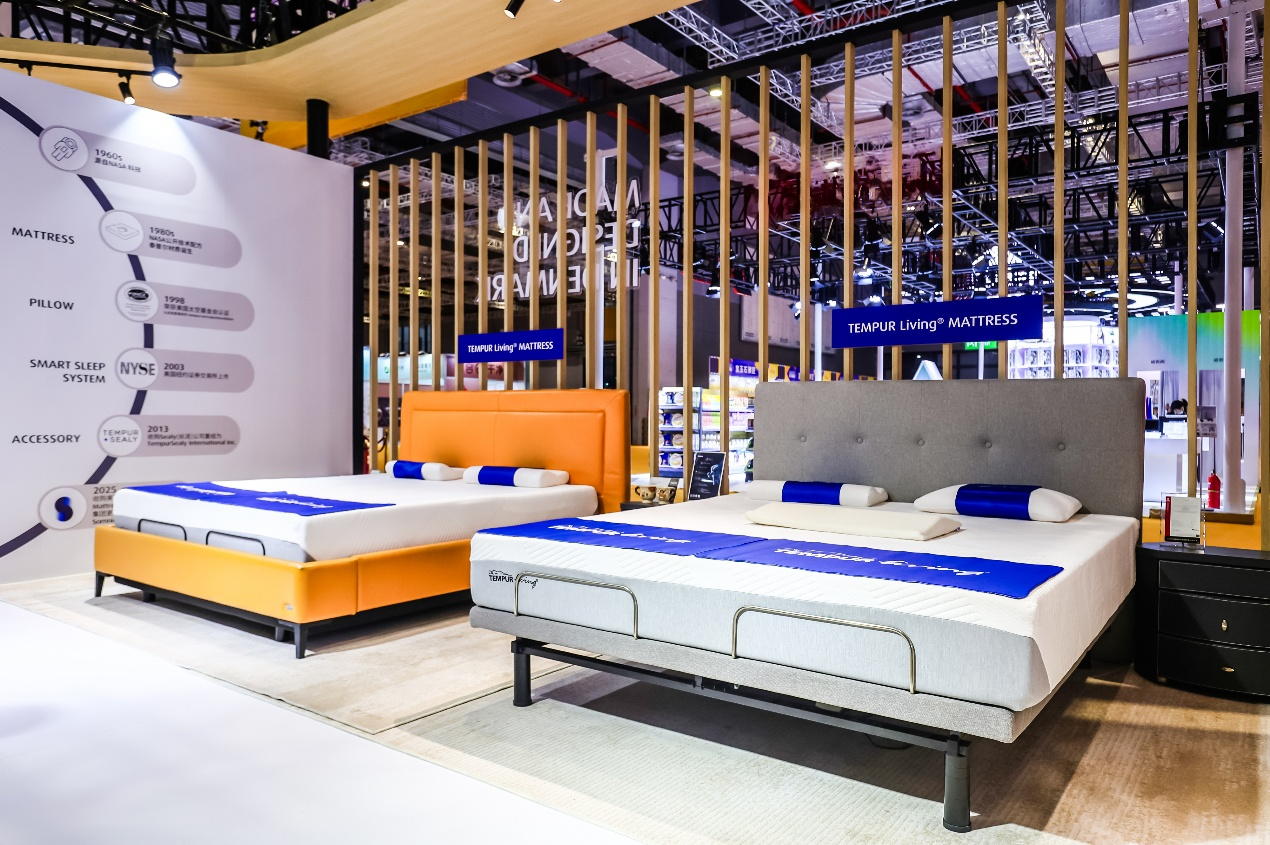 本次展会,TEMPUR®泰普尔带来了令人瞩目的SSS智能睡眠系统。该系统全称为“Smart Sleep System”,以其一体化解决方案吸引众多目光。智能睡眠系统由智能床、智慧床垫与智睡枕“三位一体”深度联动组成:智能床提供包括睡姿调整、睡眠环境监测、智能鼾动干预在内的全方位智能控制系统;智慧床垫与智睡枕则依托TEMPUR®泰普尔专利材质,通过感温自适应技术精准承托,紧密贴合头、肩、腰、臀曲线。三者协同发力,实现了“科技与舒适的无缝融合”,让每一次躺下都成为全身心的深度解压体验,真正使优质睡眠触手可及。