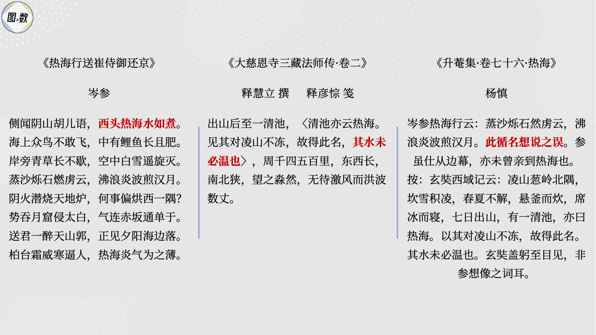 实际上,比岑参稍早一些的释彦悰(cóng)在《大慈恩寺三藏法师传》的笺注里就指出热海“其水未必温也”,它只是因为紧邻皑皑白雪的天山(唐时称之为凌山)却不冰冻,所以名为“热海”,而明代四川的唯一状元杨慎更是慧眼如炬,准确指出岑参是犯了“循名想说之误”(详见《升菴集·卷七十六·热海》)。