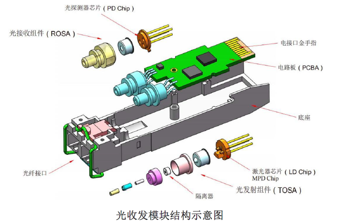 光模块主要由光发 / 光收部件(TOSA、ROSA)、带电芯片的电路板、封装外壳和接口组成。