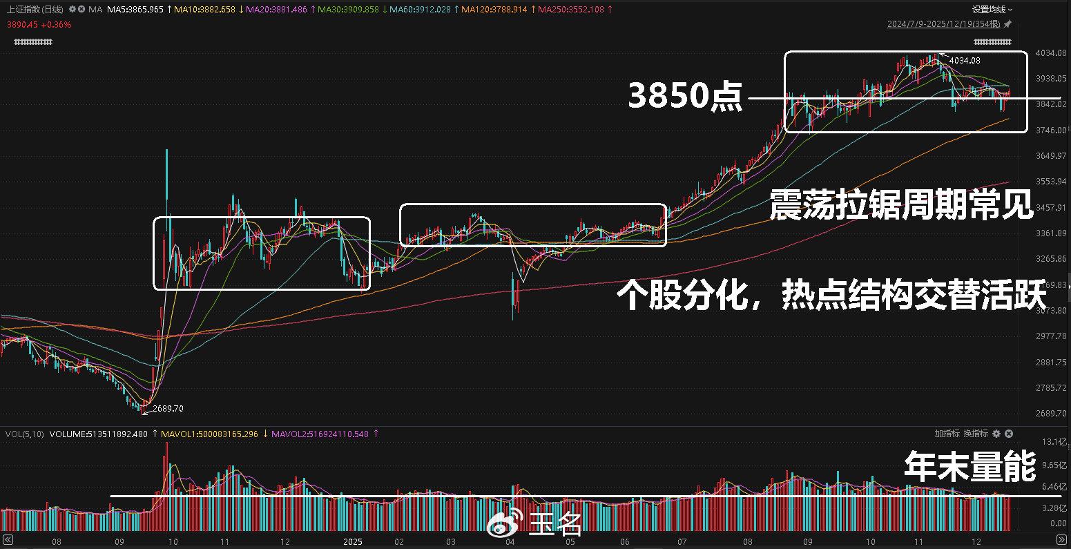 12月份已经过去大半,而市场也进入到了明显的年末状态了,或许还有煎熬的周期,一切未来了来年考虑。点位方面3850点,管理层的心理位置又大块头守护者,剩下大部分个股就是蓄势的状态。大家明白这样周期的意义,一切就都明了。如果没有这样大的视野,那么就容易纠结,且看不到真正的方向。尤其是年末调整,反而是酝酿年初机会的核心,A股鲜有跨年行情也是源于此。