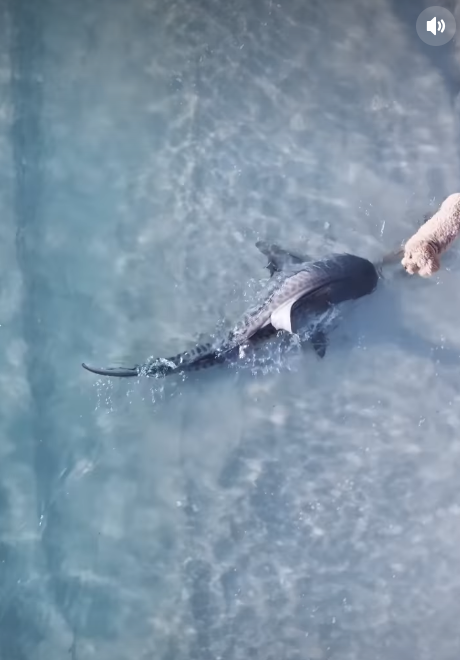 当日,几只宠物犬正在近岸浅水处玩耍,完全未察觉一条鼬鲨(俗称虎鲨)已潜至附近。无人机拍摄的画面显示,名为奥利佛的贵宾犬正与其他狗玩耍,转身瞬间发现鲨鱼已近在咫尺。奥利佛迅速跑回岸上,鲨鱼也随之掉头游向深水。