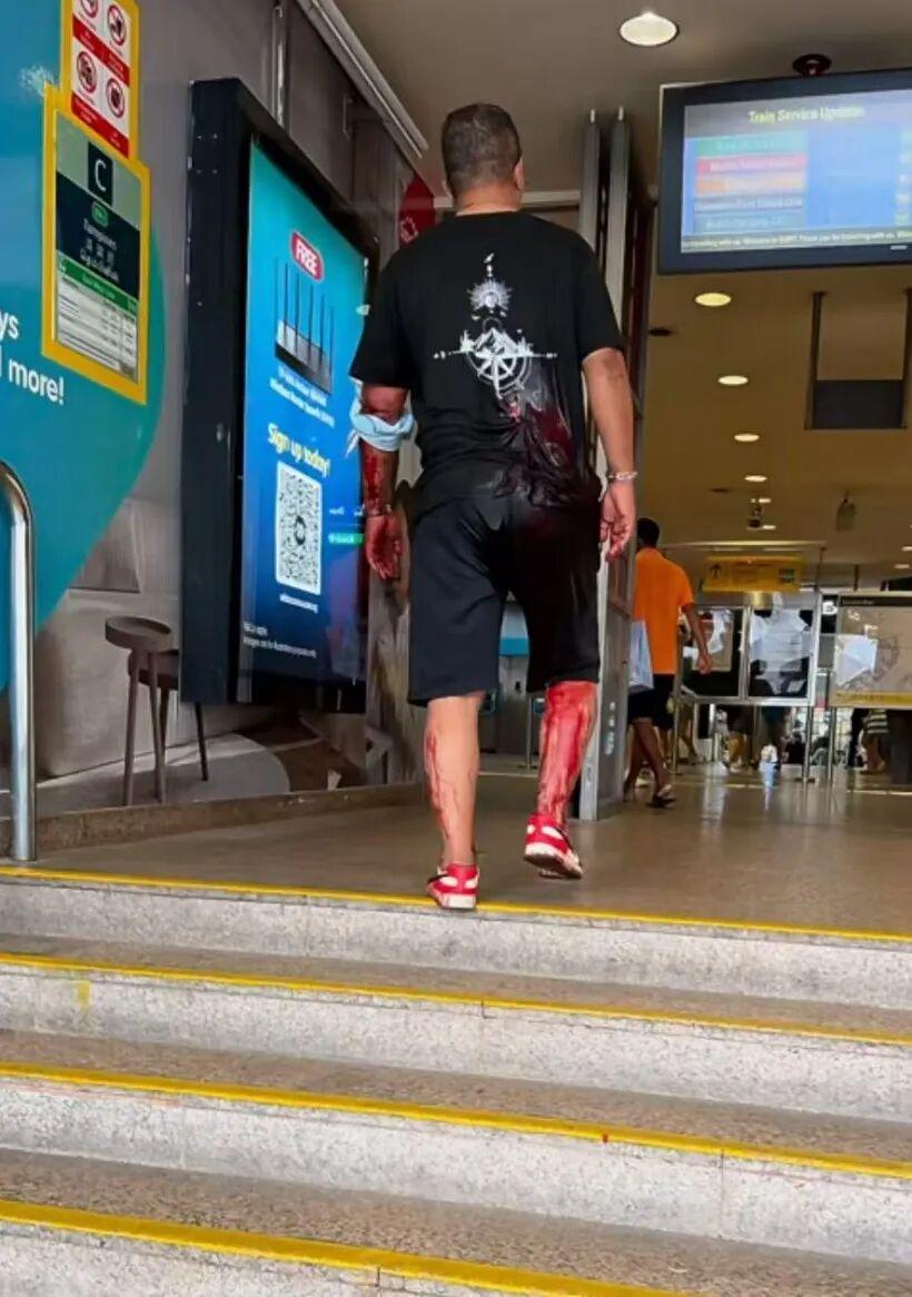他从淡滨尼地铁站朝淡滨尼商场的红绿灯走去,还跟另一男人在说话。在他身后,留下一路血迹。