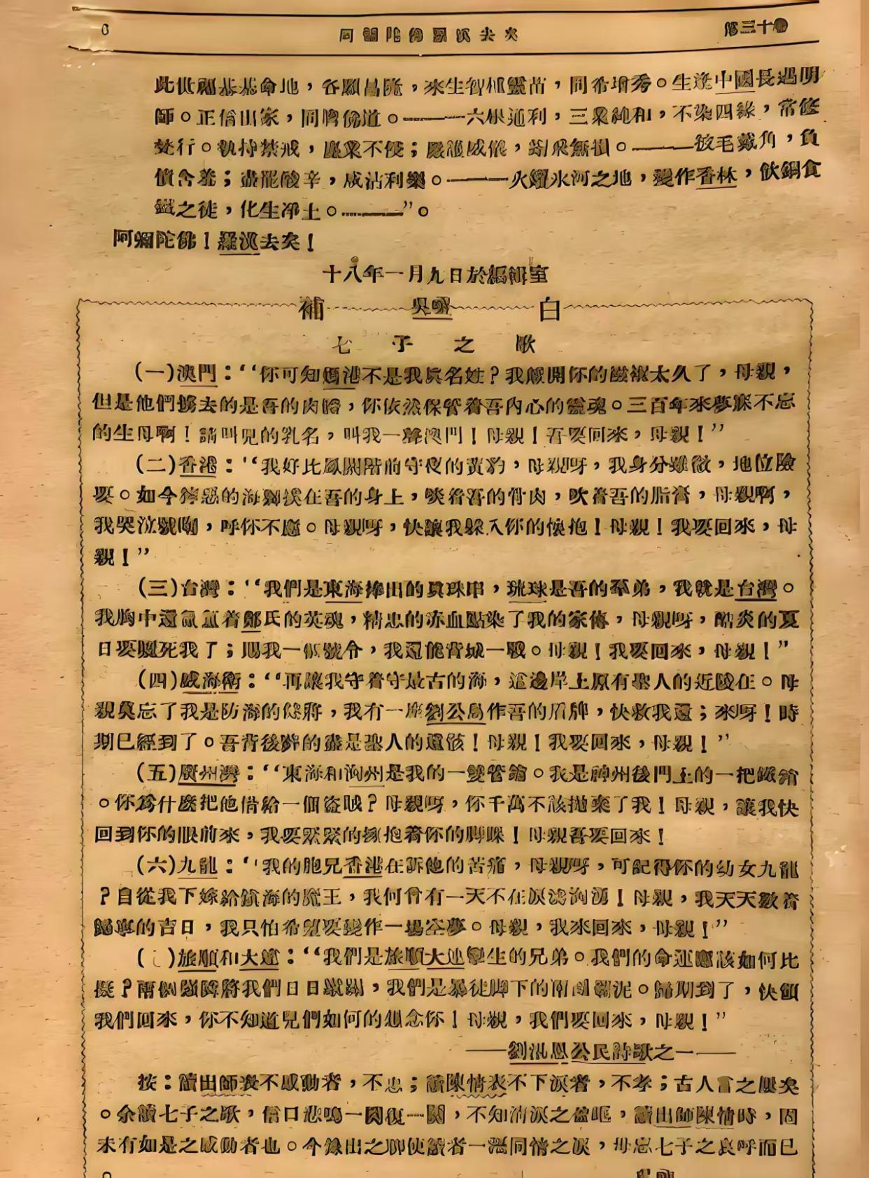 1925年,正在美国留学的闻一多,深感此时的中国正处在“山河破碎风飘絮”的至暗时刻,满含悲愤写下《七子之歌》,以血泪文字将澳门、香港、台湾、威海卫、广州湾、九龙岛、旅大(旅顺和大连)七个被割让的领土比作祖国“母亲”的孩子,以抒发对国土沦丧的切肤之痛和对祖国统一的强烈渴望。