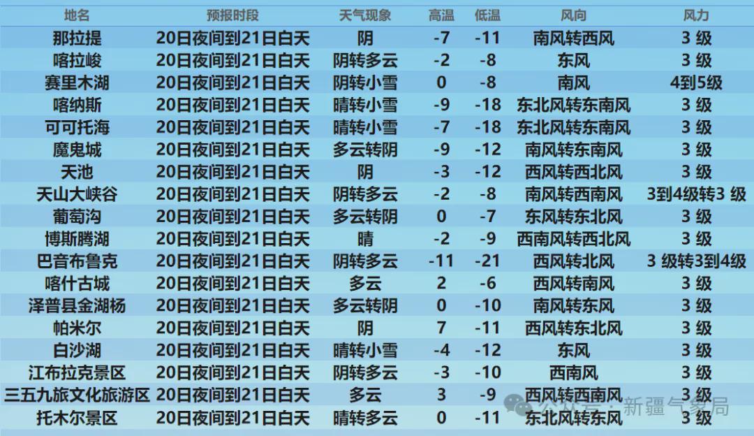 21日夜间到22日白天,北疆大部和喀什地区、克州、和田地区山区、巴州北部山区、哈密市等地的部分区域有小雪,其中伊犁河谷、塔城地区北部、阿勒泰地区北部东部山区、乌鲁木齐市山区、昌吉州山区、喀什地区南部山区、哈密市北部山区等地的局部区域有中到大雪,山区局地暴雪;上述部分区域和吐鲁番市有5级左右西北风,风口风力9~10级,阵风11~12级,局地伴有风吹雪。全疆其他地区以晴或多云天气为主,风力不大。