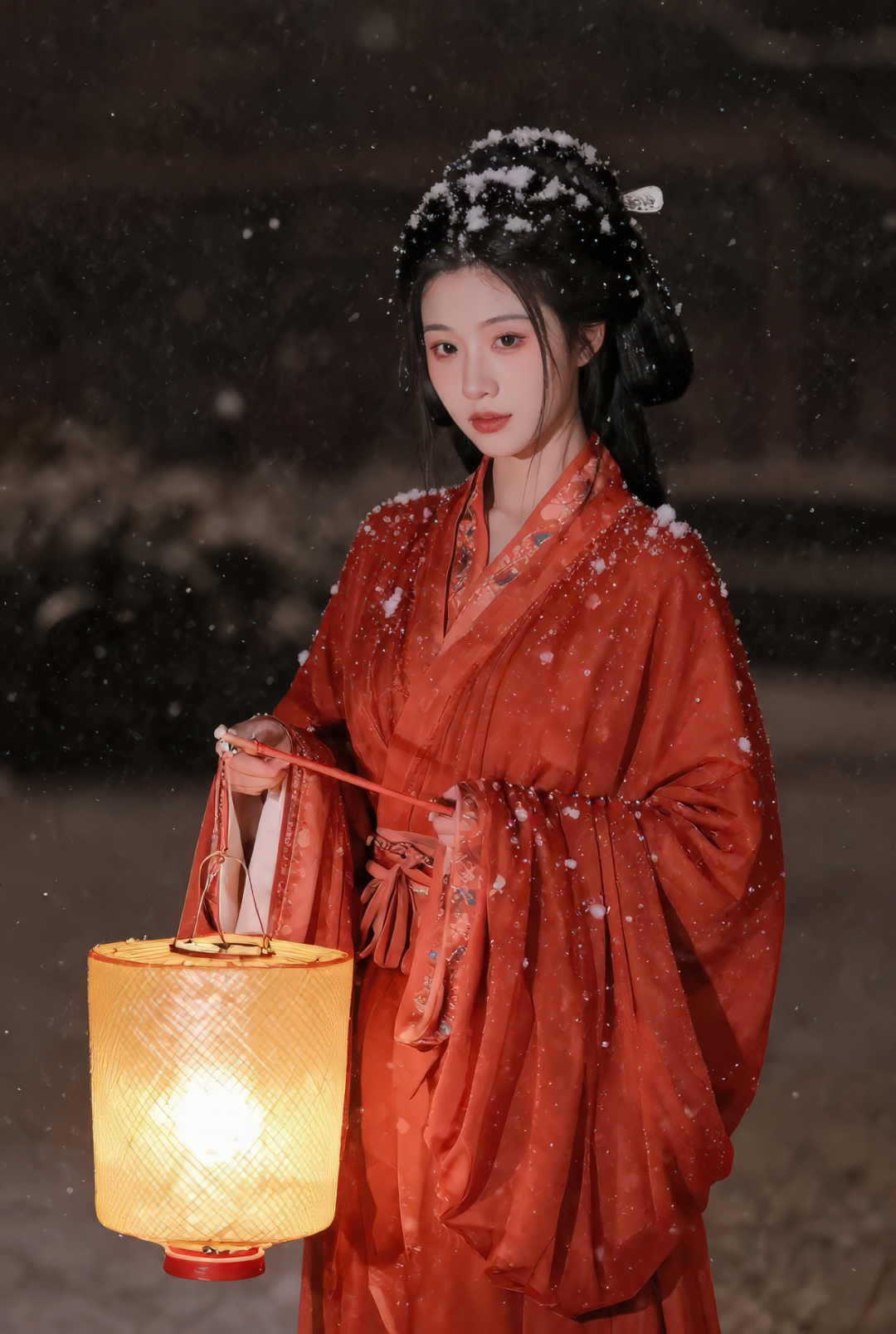 中景镜头,年轻东亚女性身穿朱红色汉服,手持古风灯笼立于雪中。雪花在暗色背景下清晰可见,落在发丝与衣袖之上。自然夜间光线与灯笼光相互映衬,雪地反射柔光,营造温暖而诗意的古风雪夜场景。构图:竖构图,超高清画质。