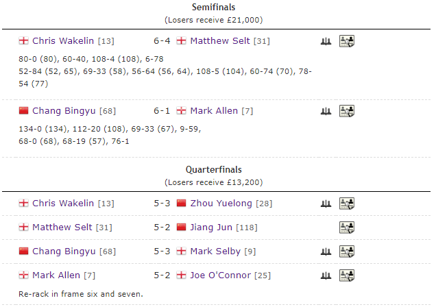 接下来的1/4决赛,艾伦以5-2战胜乔-奥康纳晋级四强。半决赛,艾伦对阵中国小将常冰玉。这场比赛,常冰玉打出了非常霸气的表现,开局3-0领先,之后又以5-1赢得四个赛点,并以6-1的比分赢得这场半决赛的胜利。冠军战,常冰玉迎战克里斯-韦克林,期待他的好消息!