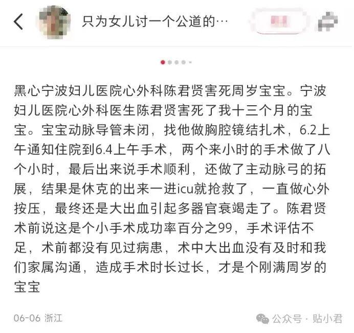 2025年6月,1岁患儿动脉导管未闭手术中死亡,家属控诉陈某君“术中大出血未沟通”。