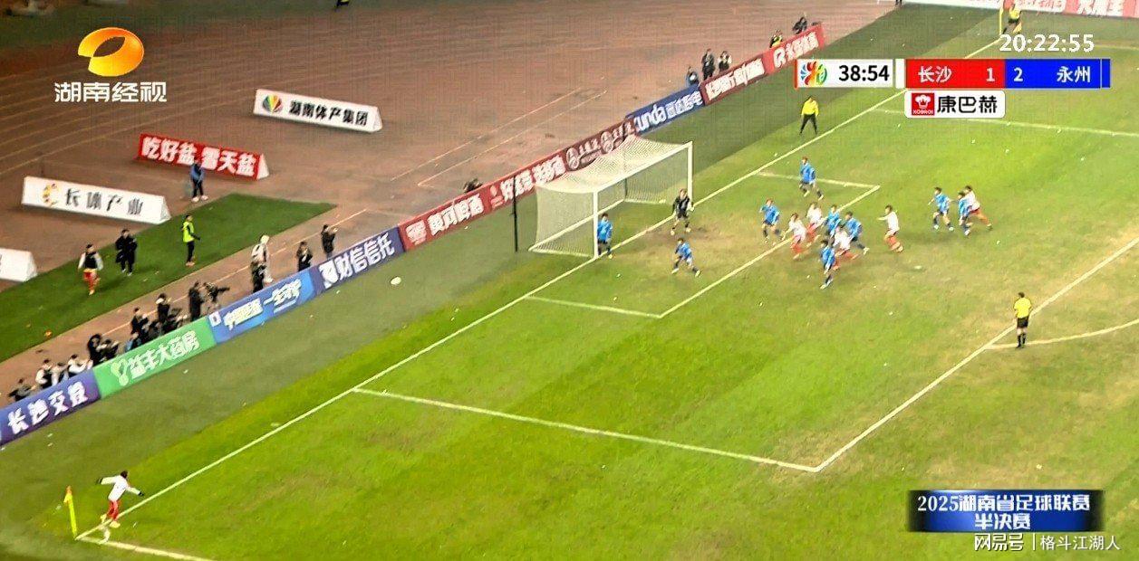 8分钟多,永州队进球了,20号彭玢打进扳平一球。林昊在右路的突破造成长沙队肖劲光的犯规,永州队获得一个定位球。21号邢隽恺开前点,第一点被长沙队破坏,第二点被彭玢拿到,他拿球后调整后一脚世界波破门。