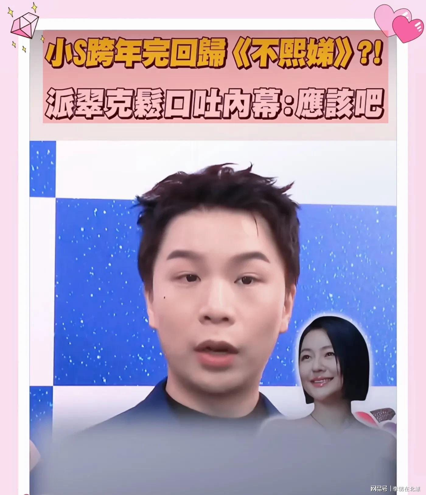 近日小S搭档派翠克出席活动的时候,被问到搭档小S跨完年会不会回归《小姐不熙娣》,派翠克回应,应该会吧!之前派翠克就说过私底下跟小S一直有联系,想必派翠克应该很了解小S的动向!他说快了,应该就很快了!