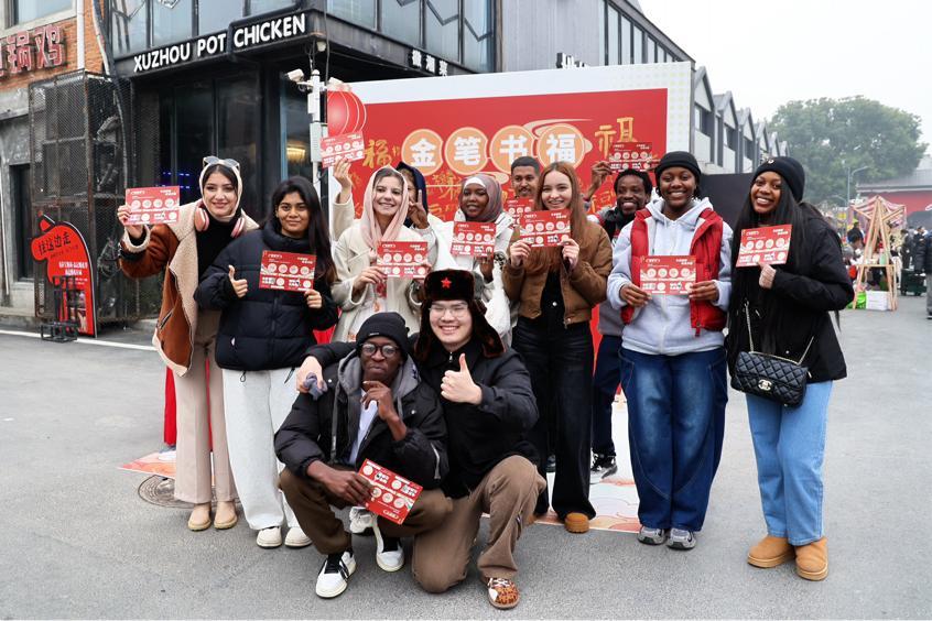 这场主题市集将冬至节气与文化消费深度融合,特别设置“冬至暖心汤圆铺”与“冬至福气饺子站”两大福利区域,让“饺子派”与“汤圆派”各得其乐。市集上,一群外国面孔排队领取汤圆,他们是来自安徽中医药大学的留学生,在各个摊位前流连忘返。投壶、书福,留学生们沉浸式体验传统游戏,还在涂鸦墙前拍照留念,“耶”“好玩”的赞叹声不绝于耳。