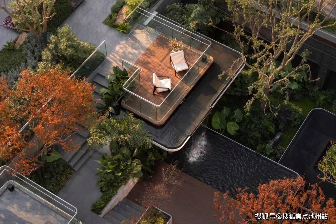 在有高差的地块,嘉宸没有走下沉式庭院的老路子(窗外有江,谁还会把视野围合在方寸庭院),而是用悬停的平台、错落的叠水,枫叶与乌桕穿插,让平铺的庭院竖了起来,形成园区的「3D照壁」,另一条悬浮的归家之路。
