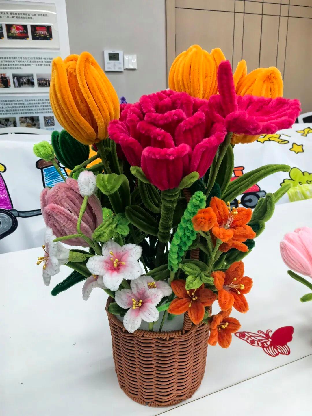 现场布置充满艺术气息。墙上挂着色彩独特的画作,长桌上陈列着盘扣、扭扭棒花束等手工艺品,这些都是伙伴们在全年活动中亲手创作的。他们曾在“艺心绽放·疗愈花园”系列活动中通过音乐、舞动、戏剧表达情感;在“彩虹工坊”学习制作简单餐食和手工艺品。