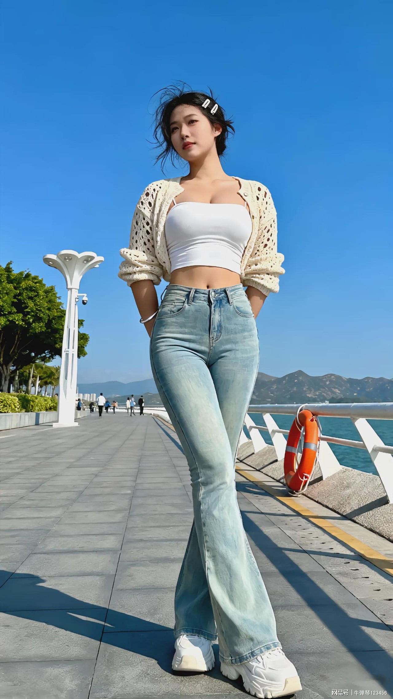 不同材质的对比也很有意思,皮质的帅气,牛仔的随性,吊带的柔软,层次丰富得很.感觉就像一个挺有自己态度的女孩,带点复古机车范儿,但又不夸张,在有点生活化的背景里,反而突出了那种不羁的个性,好像随时能出发去兜风.