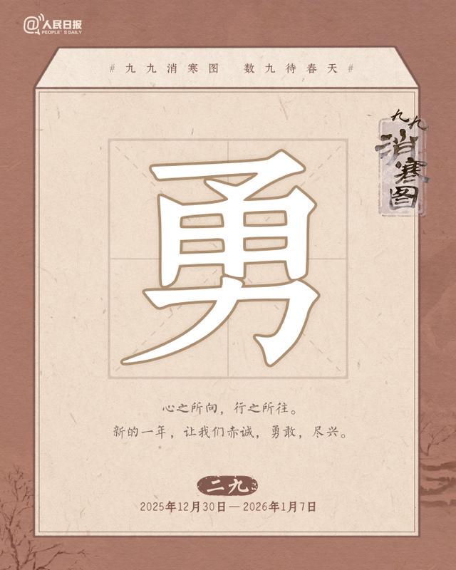 今日冬至,“数九寒天”正式开启。在“数九”习俗中,兼具“日志”与“游戏”功能的“九九消寒图”,赋予“熬冬”以雅趣。9个九画汉字,每天按笔画顺序填实一笔,在笔画旁记下当日天气,写满九字八十一笔,春天就到了。一起试试吧!
