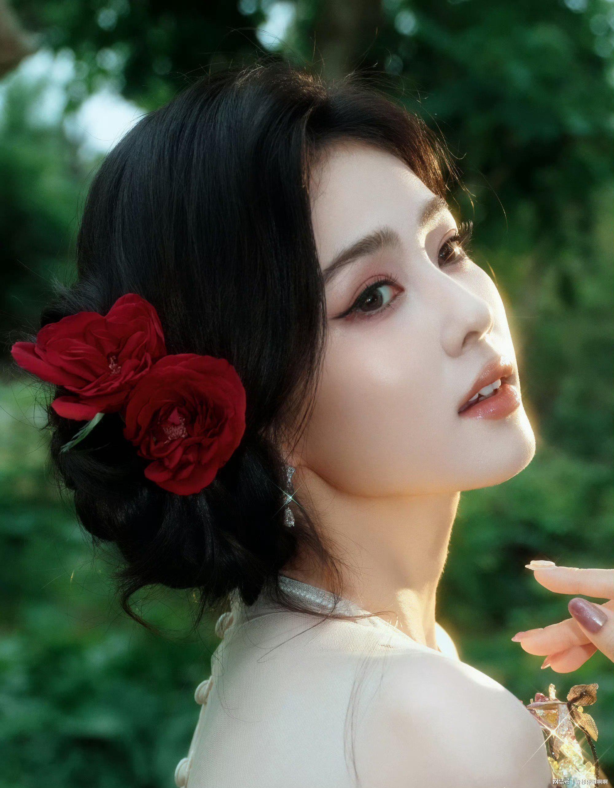 下,盘发造型搭配红花,撞色设计凸显明艳感,仿佛“油画中走出的春日精灵”。