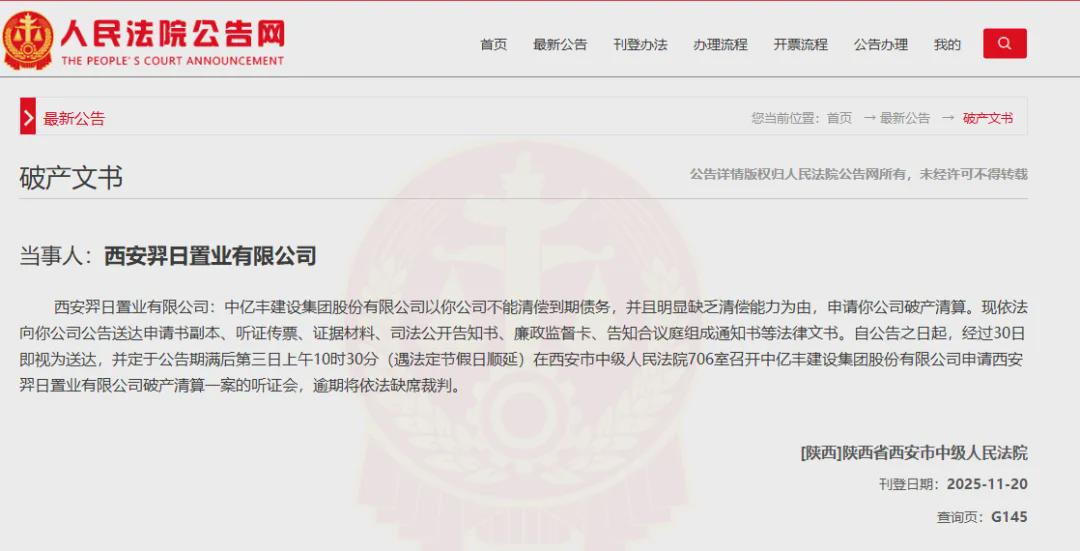 2025年11月20日,陕西省西安市中级人民法院在人民法院公告网上发布《破产文书》显示:中亿丰建设集团股份有限公司以西安羿日置业不能清偿到期债务,并且明显缺乏清偿能力为由,对西安羿日置业申请破产清算。