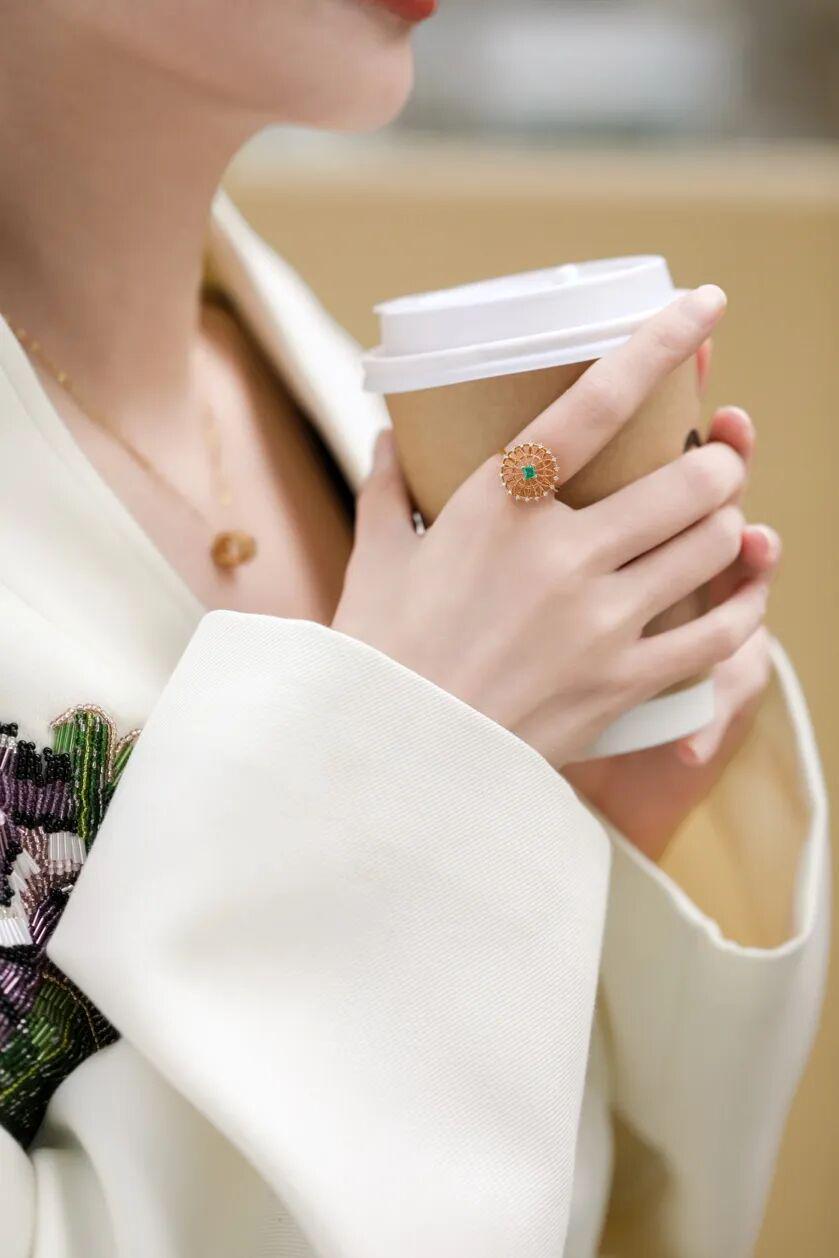 像这枚人见人爱的摩天轮蕾丝绿宝石戒指,用的是品牌与日本山梨县金工厂合作完成的滚珠边工艺。