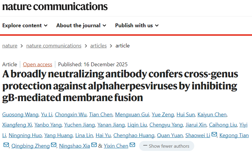 2025年12月16日,厦门大学陈毅歆、夏宁邵、郑清炳、李少伟和国家兽用药品工程技术研究中心田克恭共同通讯在nature communications(IF=15.7)在线发表题为“A broadly neutralizing antibody confers cross-genus protection against alphaherpesviruses by inhibiting gB-mediated membrane fusion”的研究论文。本研究报道了一株靶向α疱疹病毒糖蛋白B(gB)的广谱中和抗体16F9,该抗体可在小鼠模型中对多种病毒实现交叉保护。