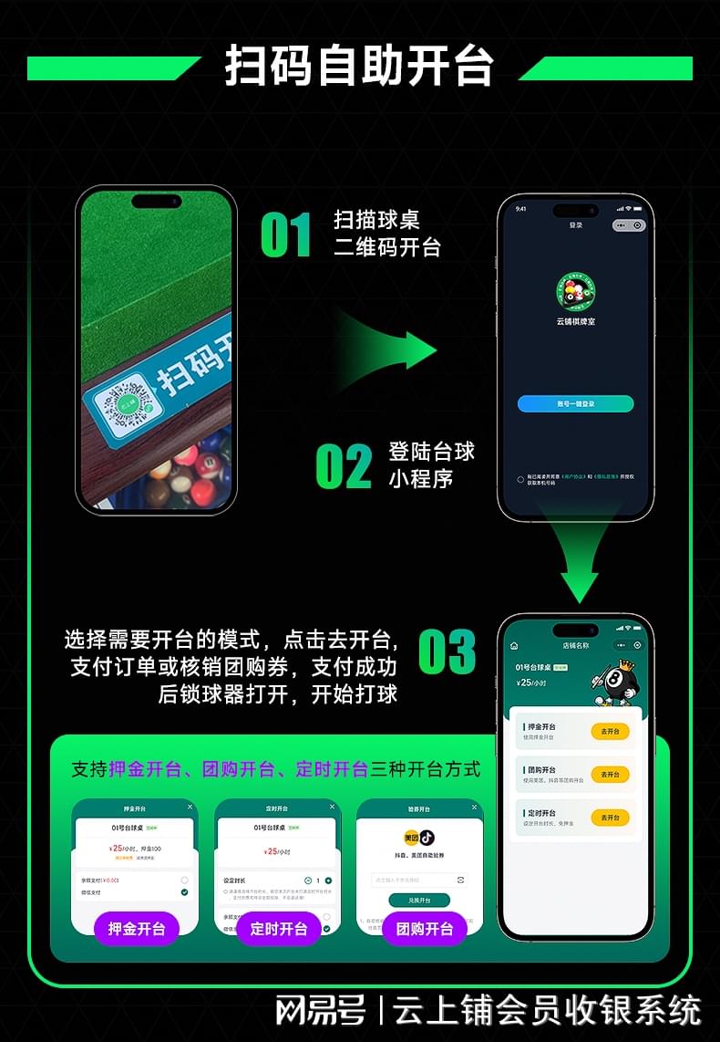 客人直接用手机扫描球桌旁的二维码,进入小程序选择开台并支付,相应球桌的灯光和锁球器便会自动开启。