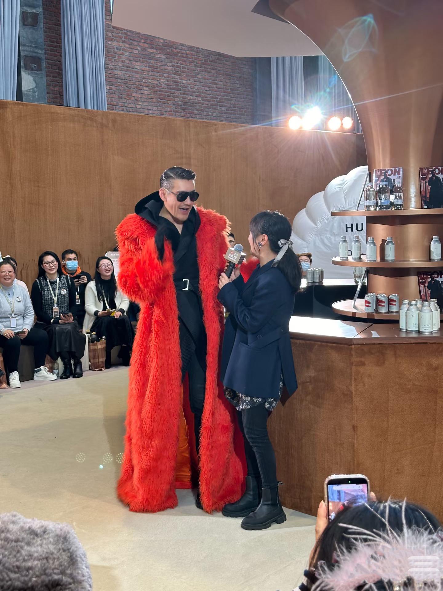 黑色西服套装,配上番茄红的皮草外套,这拖地的款式、也只有胡兵能驾驭了。他这造型一出场,就有了走T台的感觉。