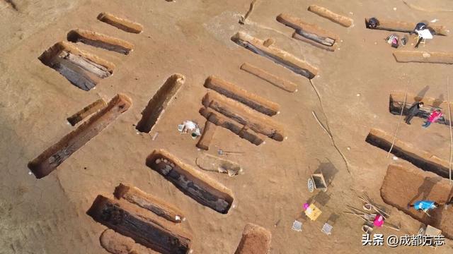 ▲盐井沟有60座船棺,是少见的大型船棺群,墓葬呈横向密集排列,大多为战国晚期