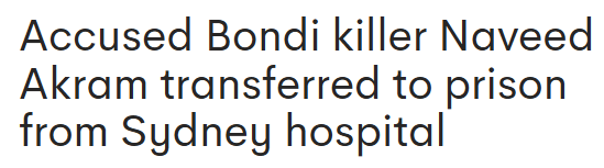 在Bondi恐怖袭击事件发生近一周之际,被逮捕的枪手Naveed Akram将从医院转移至监狱继续关押。