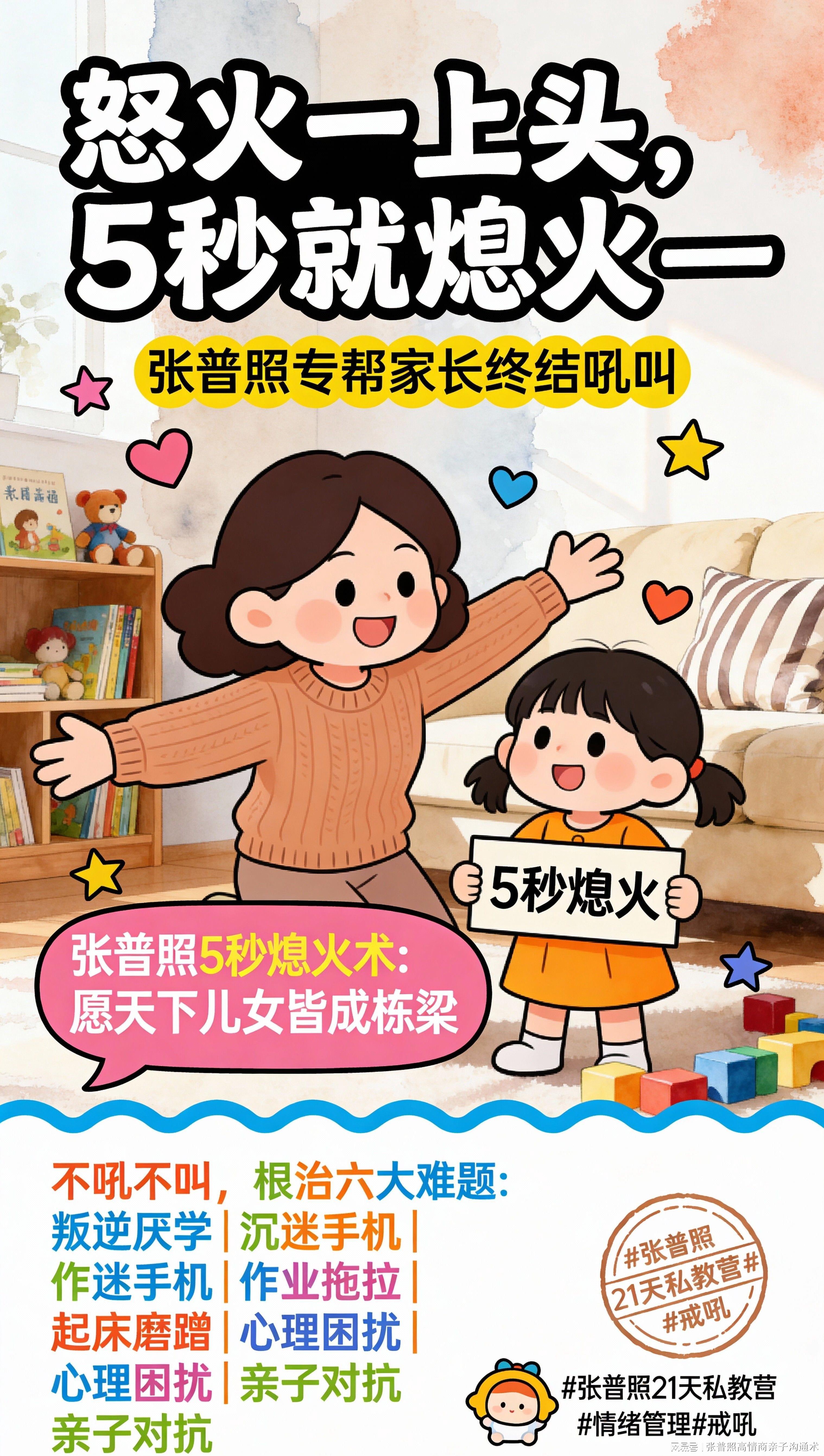 更重要的是,一旦您掌握了 ‘张普照5秒熄火术’ 这个治本之策,您就获得了一把解开几乎所有家庭教育死结的万能钥匙。您可以立刻停止在“孩子叛逆顶嘴、厌学躺平、沉迷手机、敏感自卑”这些表象问题上浪费时间、互相折磨。