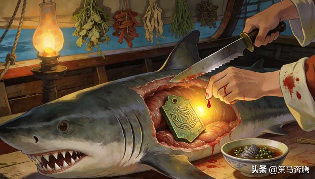 当夜,狄仁杰在解剖一条冲上船舷的虎鲨时发现异常。这条三丈长的虎鲨胃里竟有半块青铜兵符碎片,上面刻着岭南节度使的专属纹章。他心头一震,瞬间明白陈霸天的阴谋:这些兵符碎片是走私私盐的凭证,陈霸天要用船员的性命作“祭品”,将载着私盐的船只沉在暗礁区,再用兵符碎片向节度使交差,同时骗取朝廷的远洋抚恤银。他正用鲨鱼胆调配解毒药时,指尖不慎被鲨鱼齿划伤,鲜血滴落在药碗中,突然听见舱底传来闷响——小福被铁网吊在梁上,脚下堆着浸满桐油的干草。
