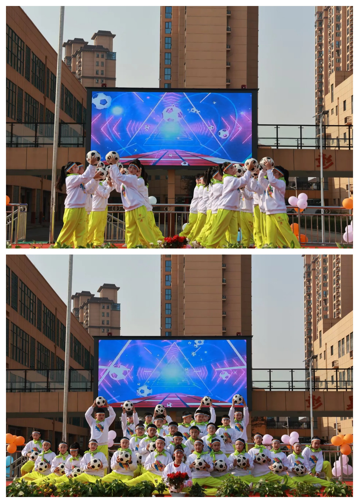 紧随其后,五(4)班、五(6)班的足球操《足球宝贝》活力登场,整齐划一的动作、阳光灿烂的笑容,展现了少年们热爱运动、蓬勃向上的精神风貌。
