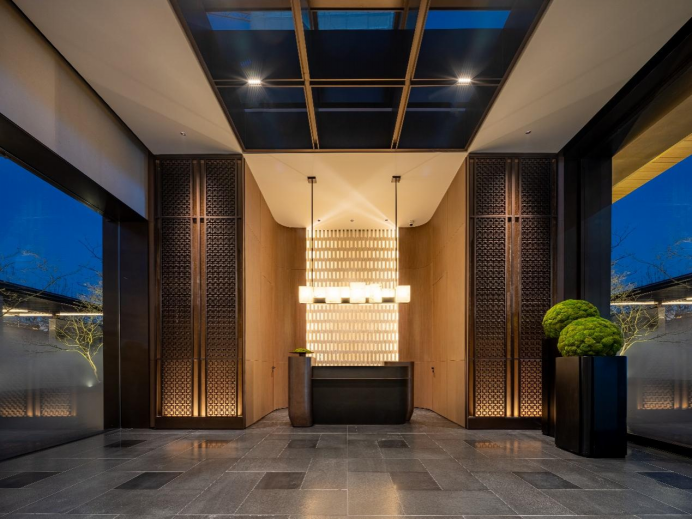 例如,在归家的动线上,保利以古代“提灯夜游”为灵感,将“灯”这一意向穿插其中——在公区入户大堂内,造型别致的壁灯格外惹眼,其灵感来自于“中国古典豆形灯”;落壁灯则是以古铜不锈钢搭配仿透光云石灯具,营造出朦胧的光晕氛围,颇具东方意蕴。