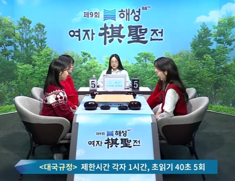 晚间时分韩国第9届女子棋圣战进行了常规余兴节目,女子双人表演赛 ,结果郑有珍/金珉舒执白胜许瑞玹/金京垠组合。