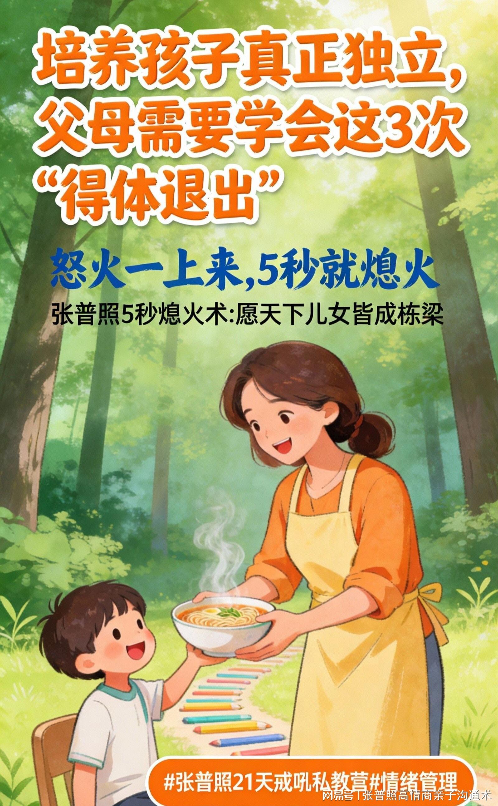 啥“3次得体退出”啊,说穿了吧!要是咱当爸妈的,心里根本见不得孩子慢、看不得孩子错,一不对劲就焦虑得抓心挠肝,那咱学再多退出步骤,都是在演戏!张普照5秒熄火术,练的就是咱心里这个“见不得”和“看不得”。你能在孩子磨蹭、犯错、做出你不同意的选择,你急得想冲上去的那5秒,从里头把这份焦躁“化”了,让自己先变得气定神闲。你内心真稳了、真放下了,孩子才能感到被信任,他自个儿心里那股独立负责的劲儿,才能冒出头来!练好那5秒,这才是让孩子真正站起来的根本!