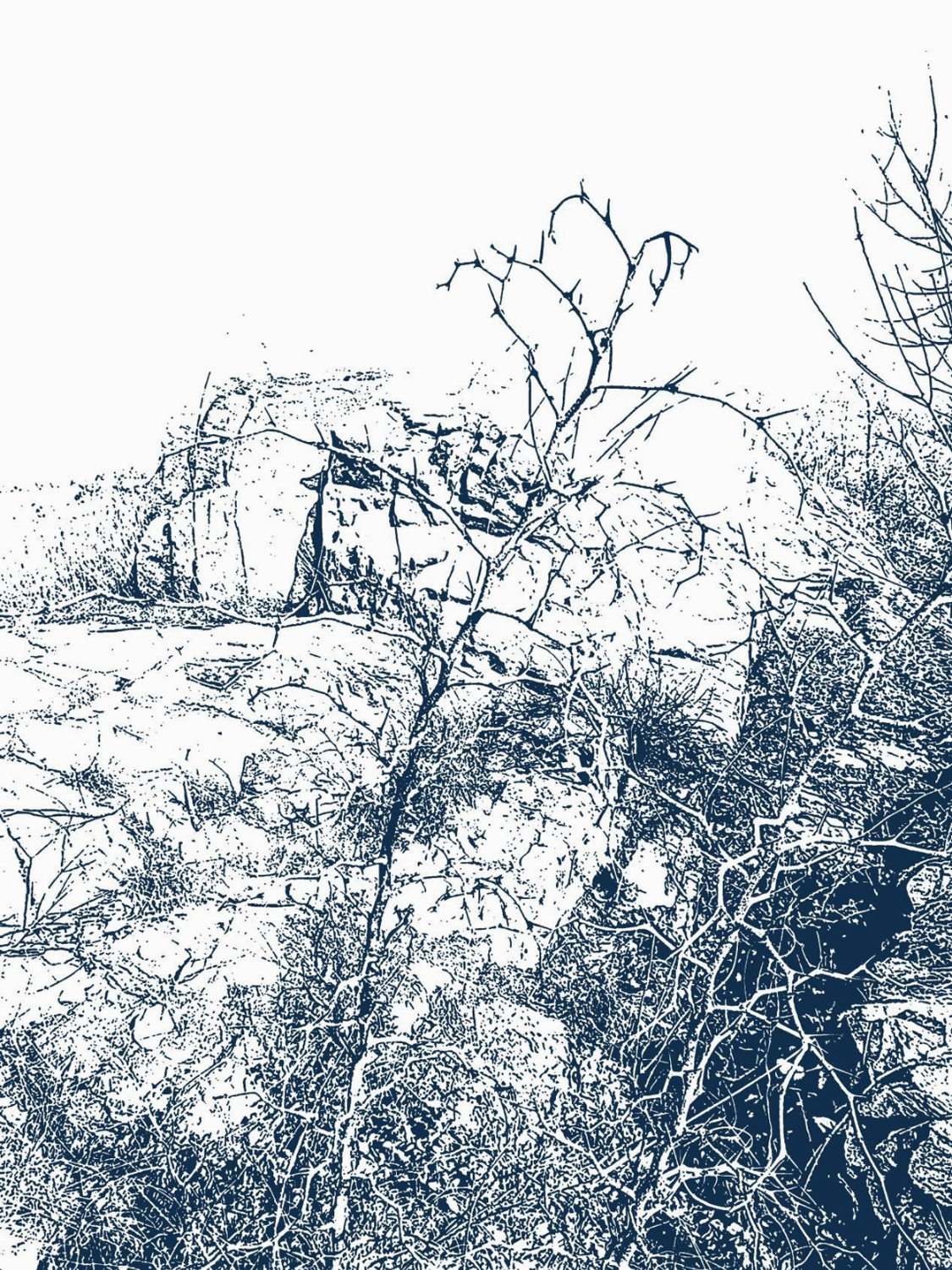 拨开灌木走近,果见三方石头。上方两石圆润相依,似一对老龟,背上斑驳的纹路如藏着年轮;下方小石翘首仰望,憨拙如随行的稚子。阳光透过枝叶洒落,石面泛着温润的光,恍惚间,竟似在静静呼吸。