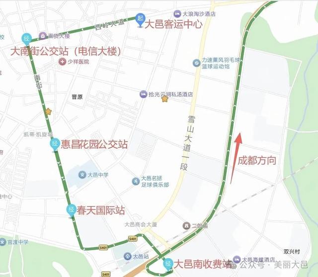 “便民快巴”线路起于大邑客运站天府行驿站,经行大南街公交站(电信大楼)、惠昌花园公交站(凯旋城)、春天国际3个站点后,通过成温邛高速直达文化宫地铁站C2口,最快通行时间仅需50分钟。