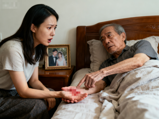 他没有回答,只是费力地抬起他那只干瘦的手,颤颤巍巍地指向床头柜上的一个相框。