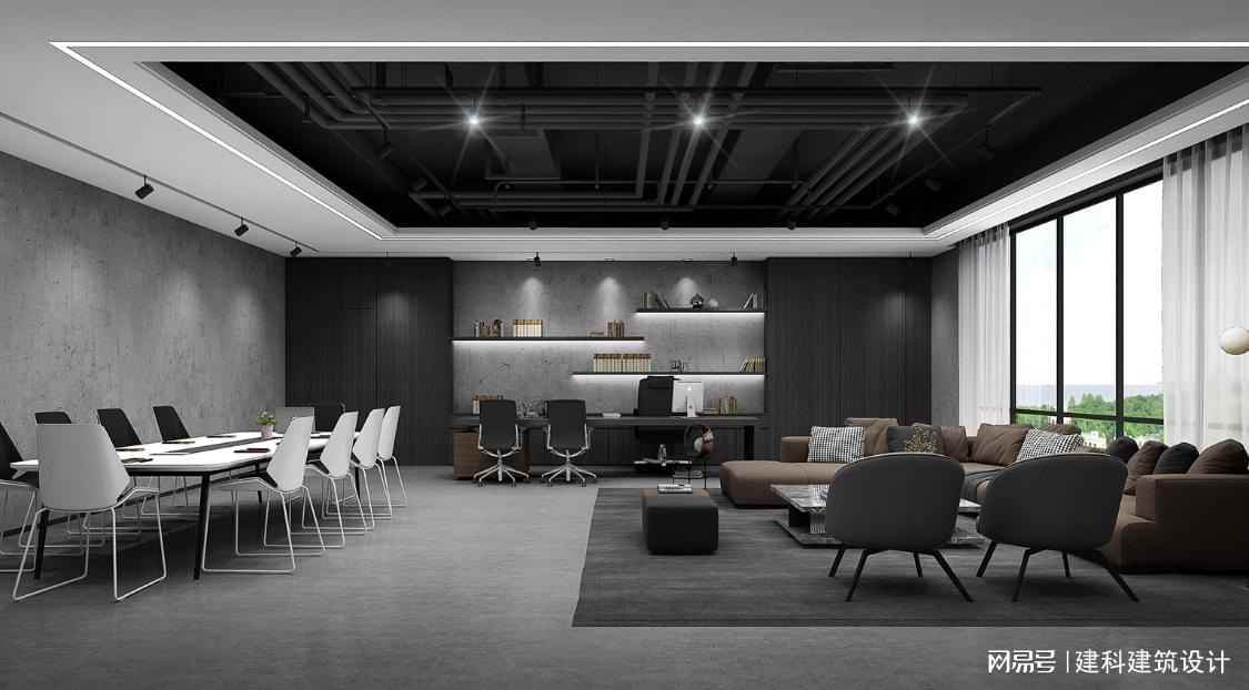这是一间把“高级感”刻进细节的办公室:裸露的工业风管线撞上极简灯光,水泥灰墙与深木色柜碰撞出冷静质感,会议区的白椅衬着长桌利落通透,沙发区的暖棕软包又裹满松弛。工作时是理性高效的战场,休憩时是能卸下心防的松弛角落,在冷与暖的平衡里,把办公变成一种质感享受。